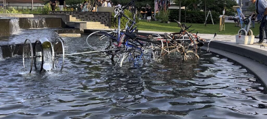Un mécanisme, basé sur des pièces de vélos endommagés, actionne une roue à aubes qui soulève des gorgées d’eau pour aussitôt les rejeter.